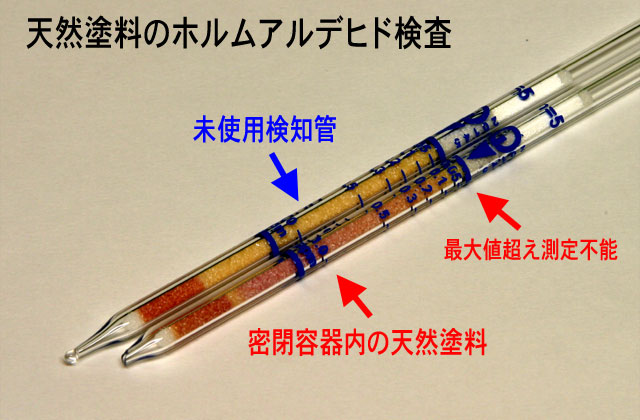 - そこで、まさかと思って塗料を密閉した袋の中に入れてガス検知管で測定したら一瞬に検知管の色が変わった。いったい何が、反応したのだろうとログハウスのキットメーカーを通じて調べた。